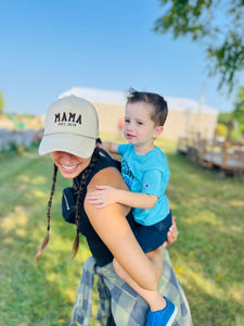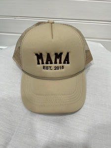 Mama Hat Est is custom embroidered to your year.  Tan trucker hat.