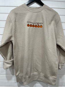 For all of you out there who love your pumpkin spice. Get ready for the holidays with this adorable embroidered sweatshirt. Ivory blend sweatshirt is made of 65% cotton and 35% polyester.