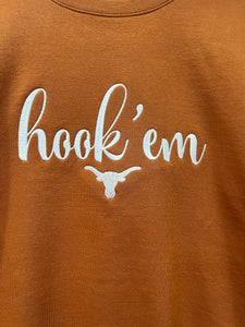 Ready for that Texas Spirit!! We have our custom embroidered hook'em sweatshirt. Warm and cozy 65% cotton 35% polyester pre-shrunk.
