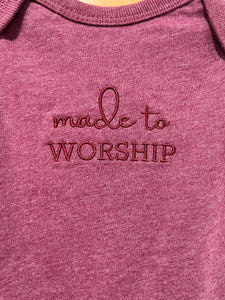 Start them early...a daily reminder we are all made to worship. This beautiful onesie is simple with a vintage burgundy colored embroidered in the same color.