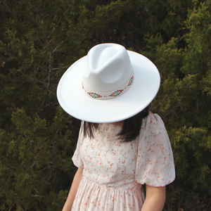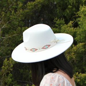 In characteristic free spirit, this classic, ivory hat with faux leather bohemian patterned band, will pair well with all your spring and summer dresses and your fave boots and best denim jeans.