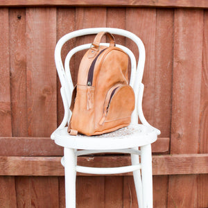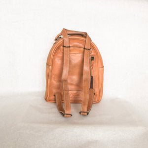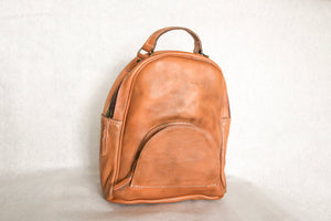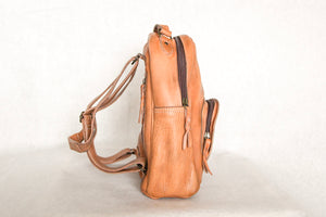 A beautiful rustic camel leather backpack with an outside pocket, double pocket interior and zipper interior with an adjustable strap that takes it from a basic backpack to an over the shoulder bag too.