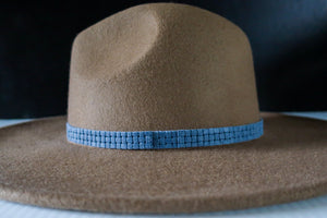 Handmade leather hat band crafted with pieces of leather embossed with a braided leather. Fits a 24” diameter.