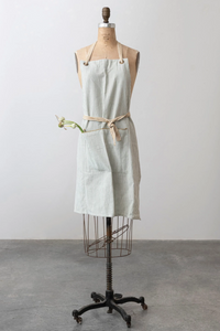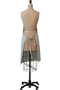 A sweet apron that is both kitchen or garden friendly with an adjustable tie strap and front pocket with mustard colors trim.